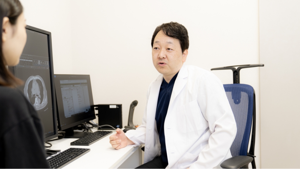 大学病院では、肺がんをはじめとする悪性腫瘍や縦隔腫瘍、気胸など、さまざまな疾患に対する治療を経験しました。ロボット手術をはじめとする最先端の外科治療だけでなく、内科的治療にも携わる機会を得ることができました。さらに、一般病院に転籍後は、呼吸器以外の内科疾患や訪問診療にも関わり、多くの患者さんと接する中で地域医療の重要性を実感しました。